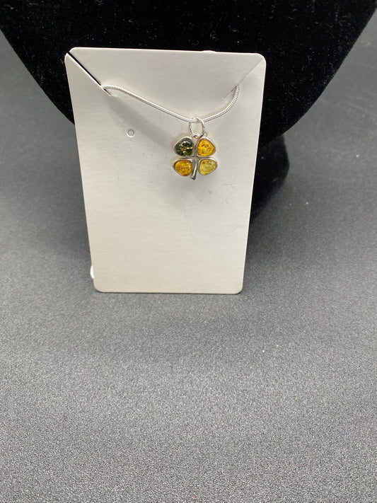 Multi Colour Baltic Amber Four Leaf Clover Sterling Silver Necklace