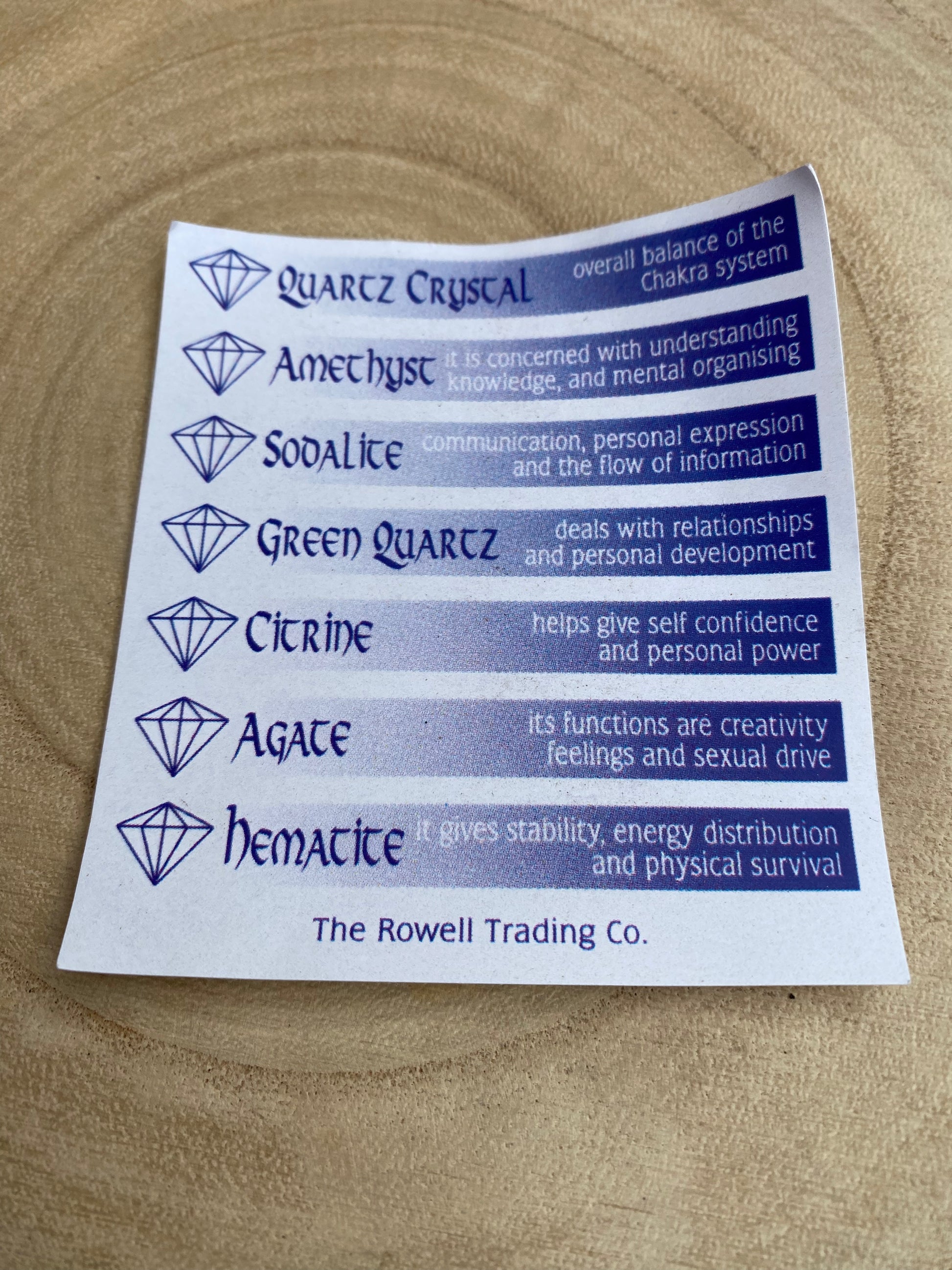 Our Chakra Gemstone Gift Set includes seven unique stones, each corresponding to one of the body's primary chakras. These stones are carefully selected for their healing properties and natural beauty, each set contains the following crystals: