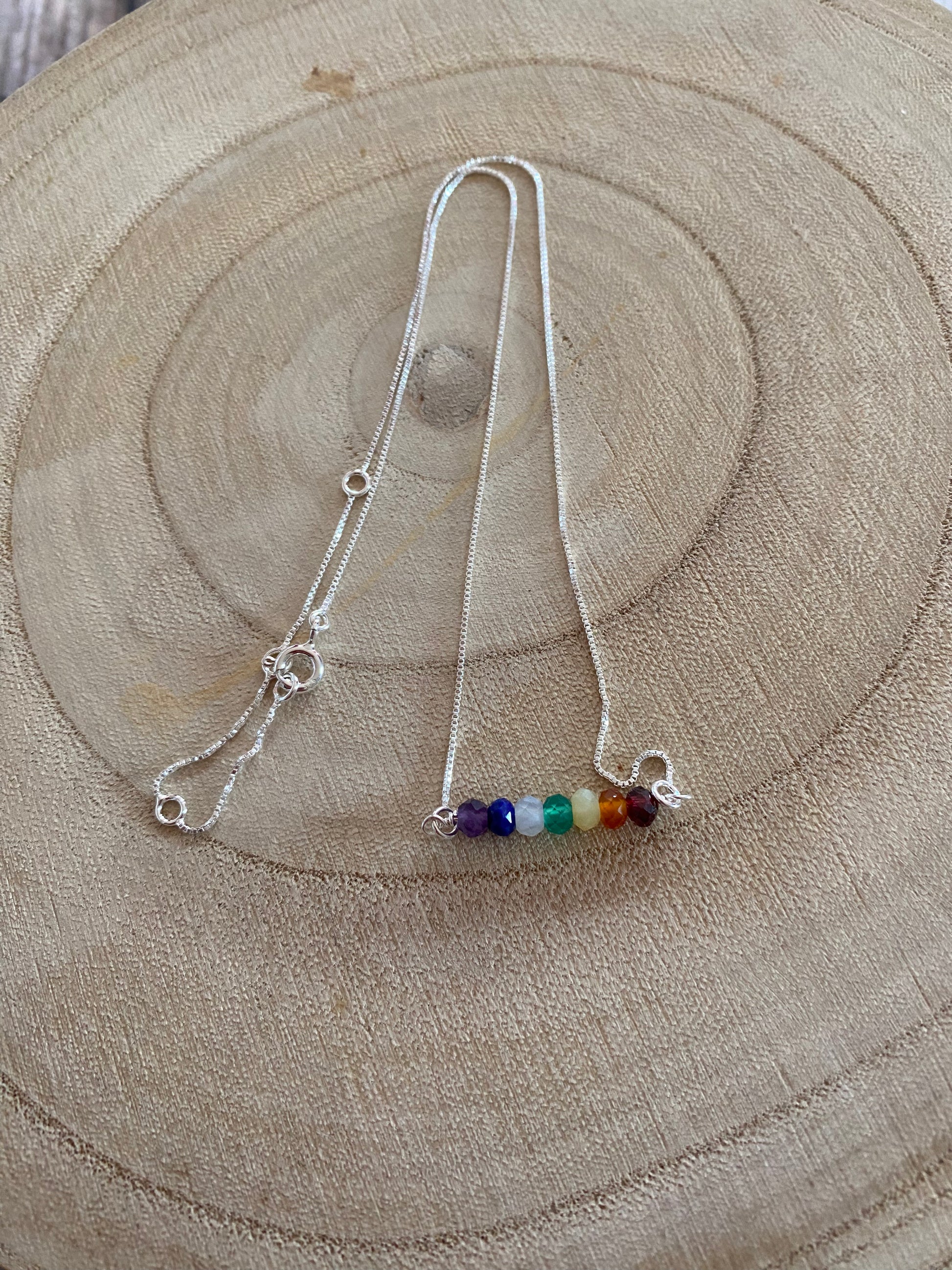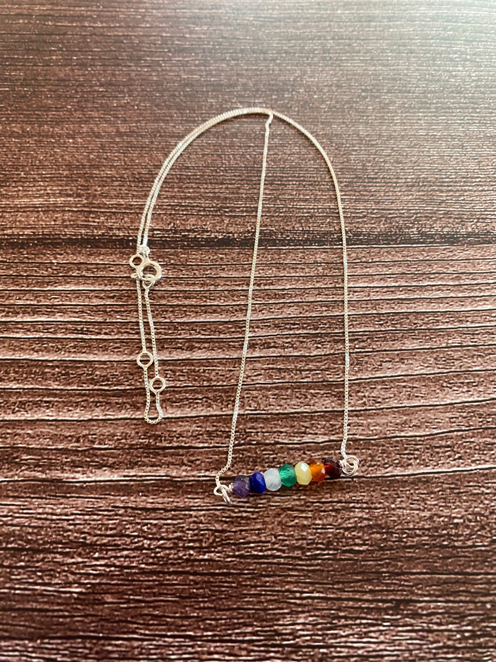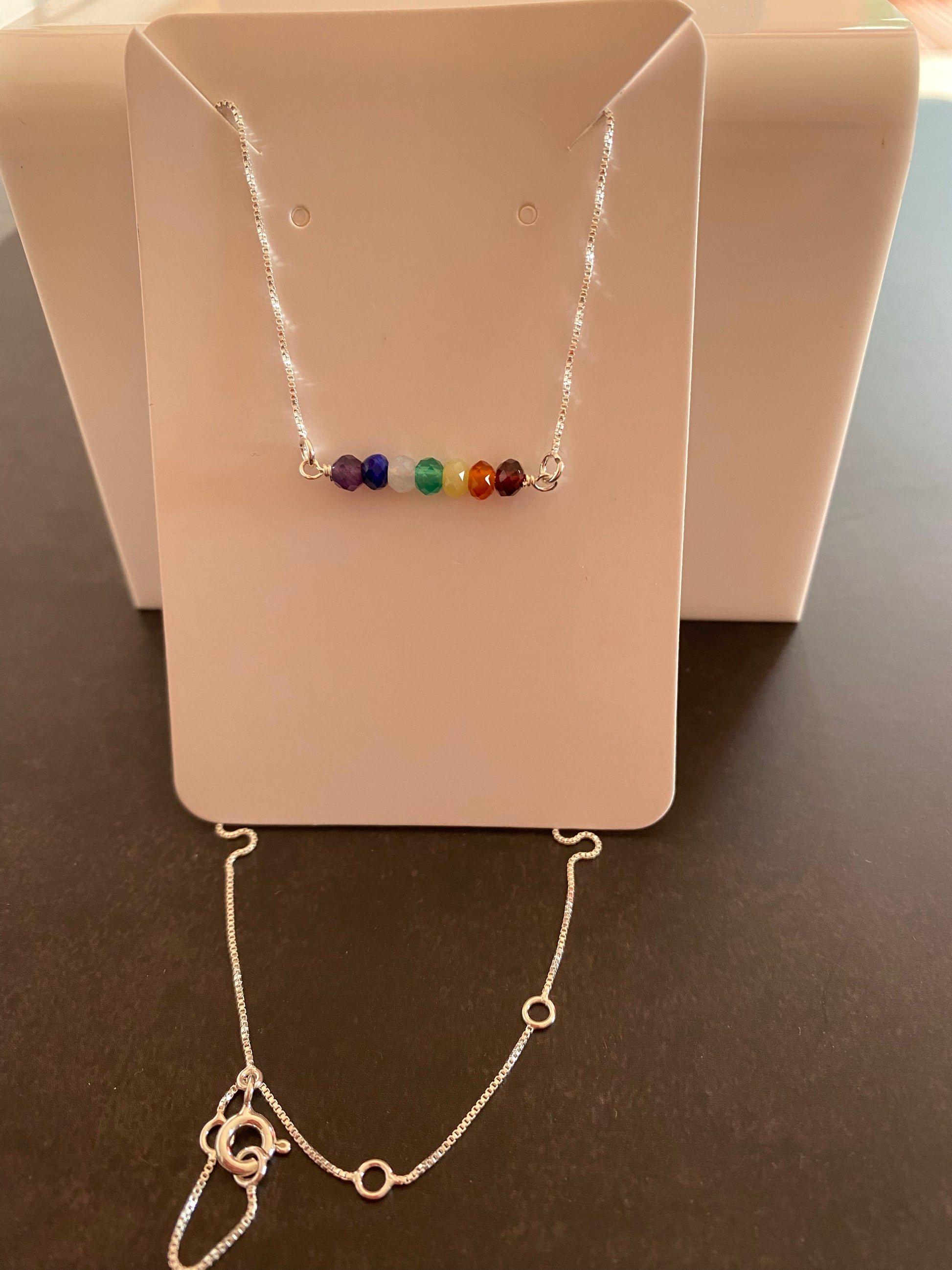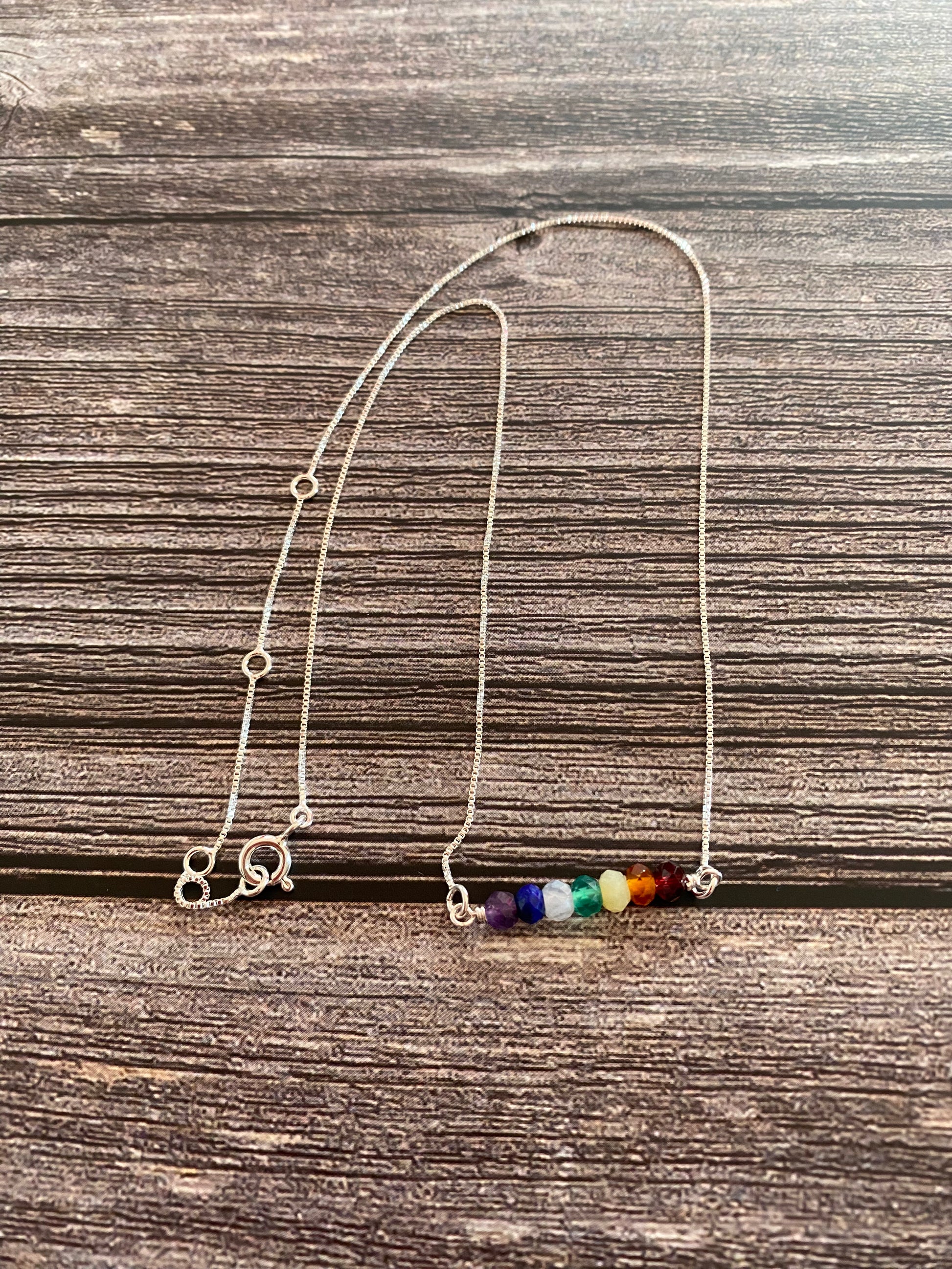 Elevate your spiritual journey with our Chakra Gemstone Sterling Silver Necklace, a beautiful piece designed to align and balance your chakras. Crafted with high-quality sterling silver, this necklace features seven carefully selected gemstones, each corresponding to one of the body’s seven energy centres. The gemstones include: