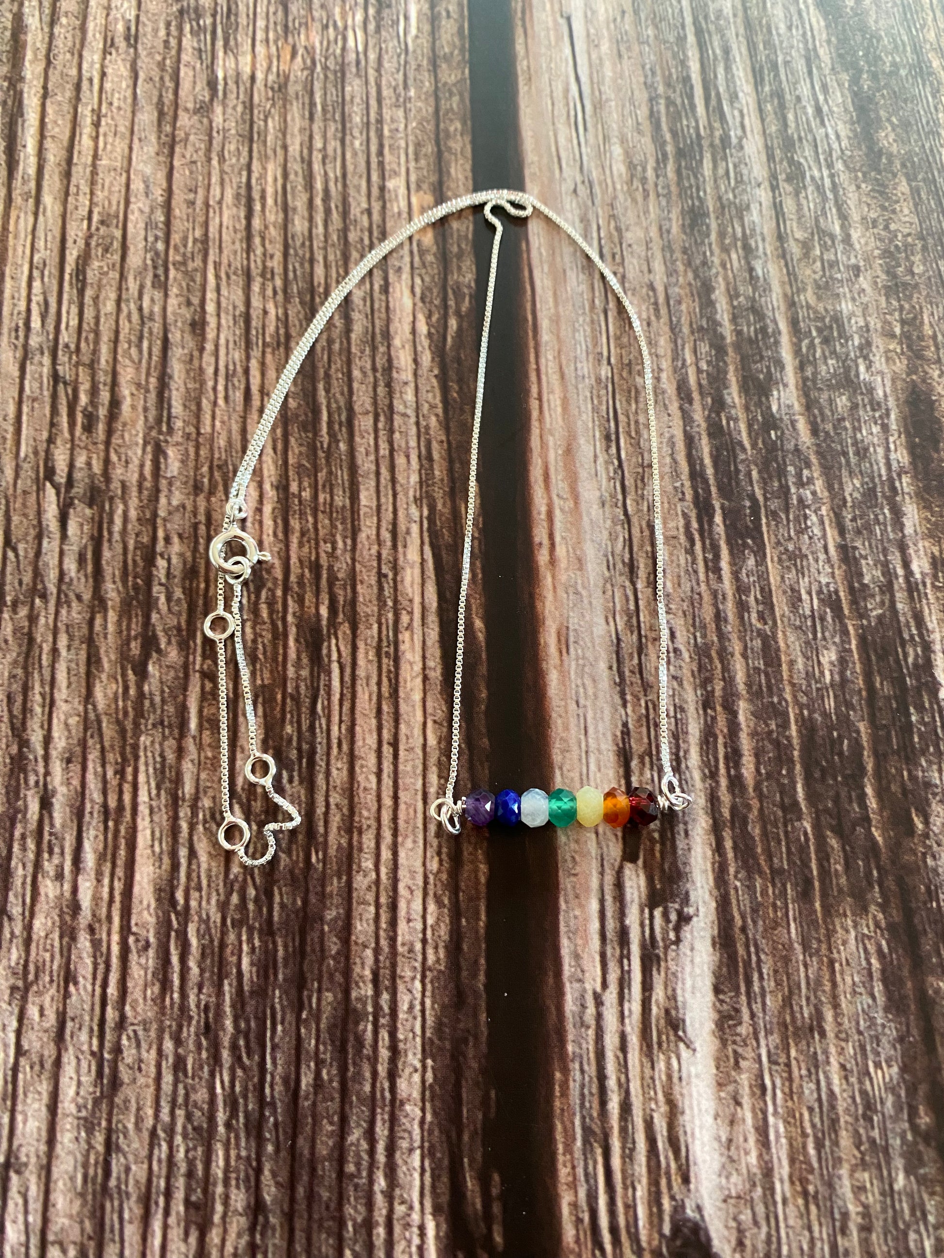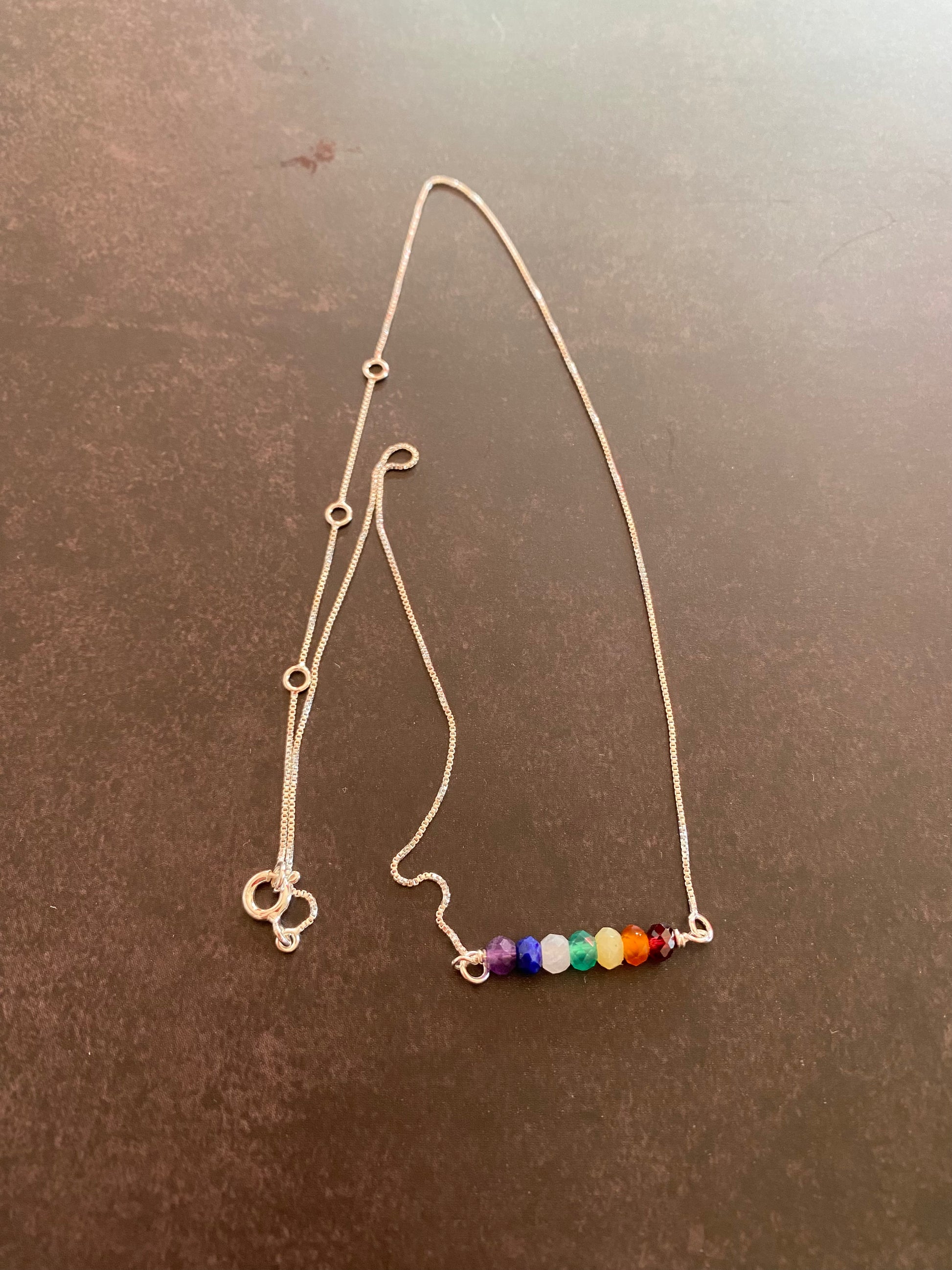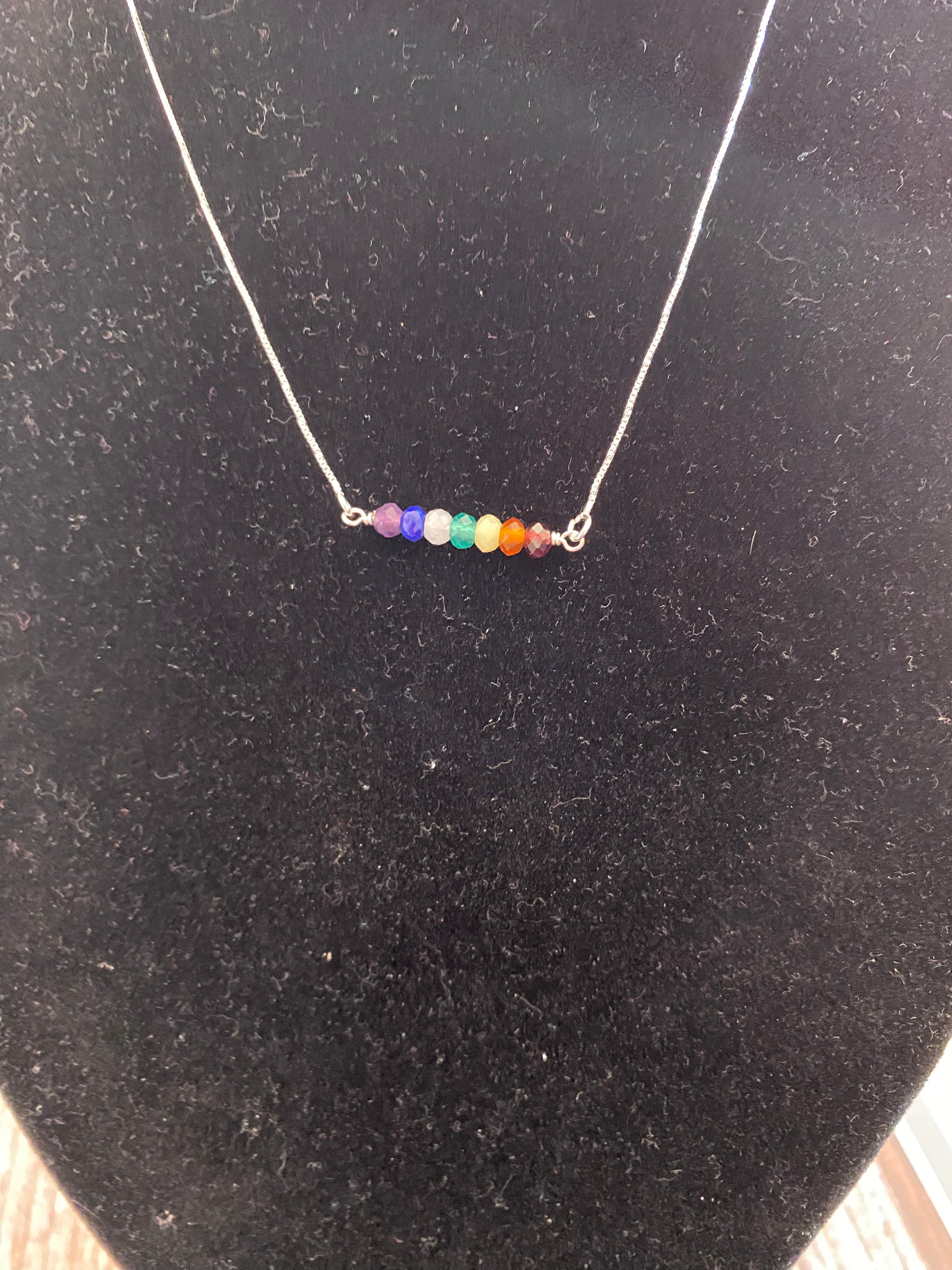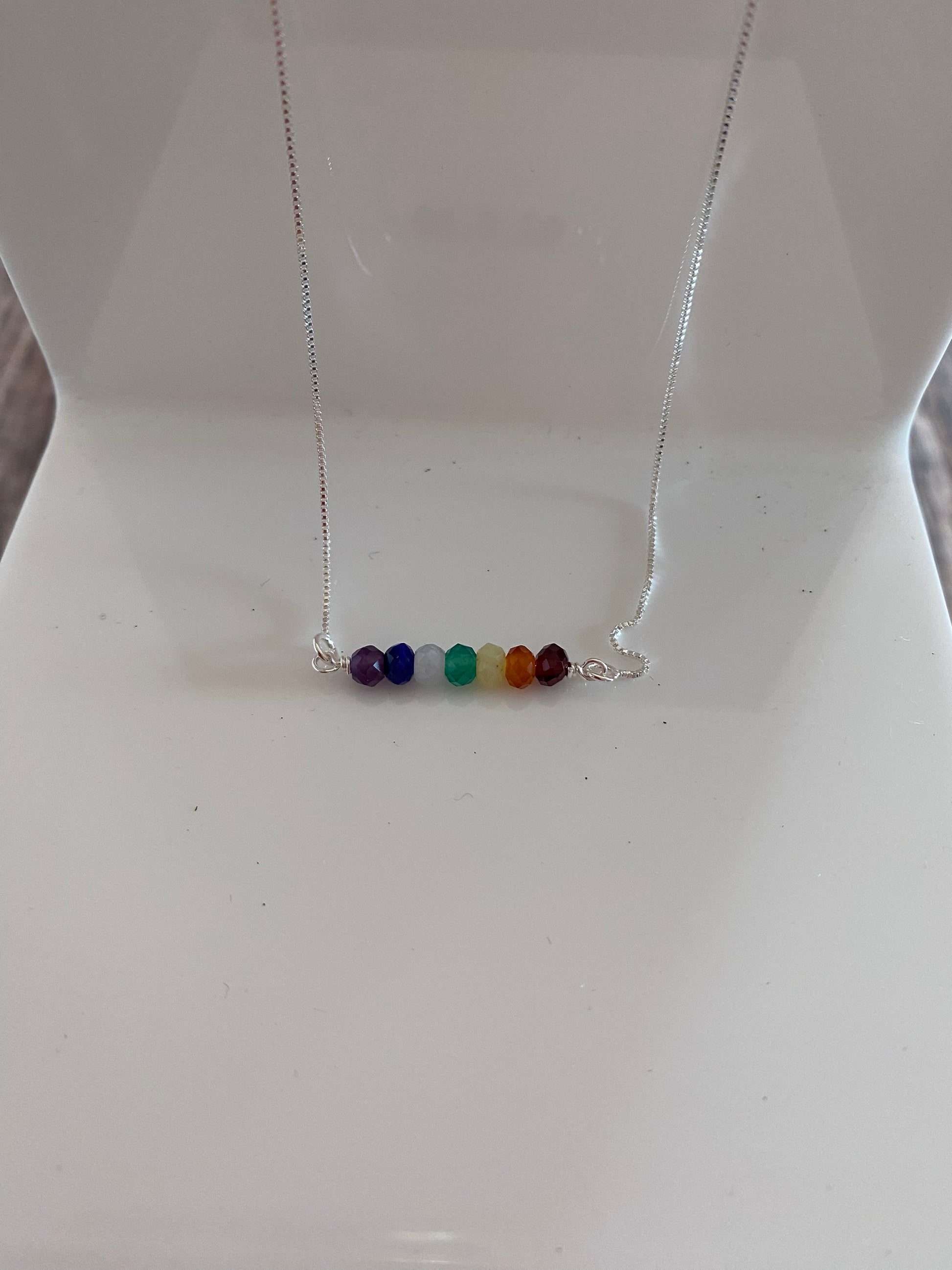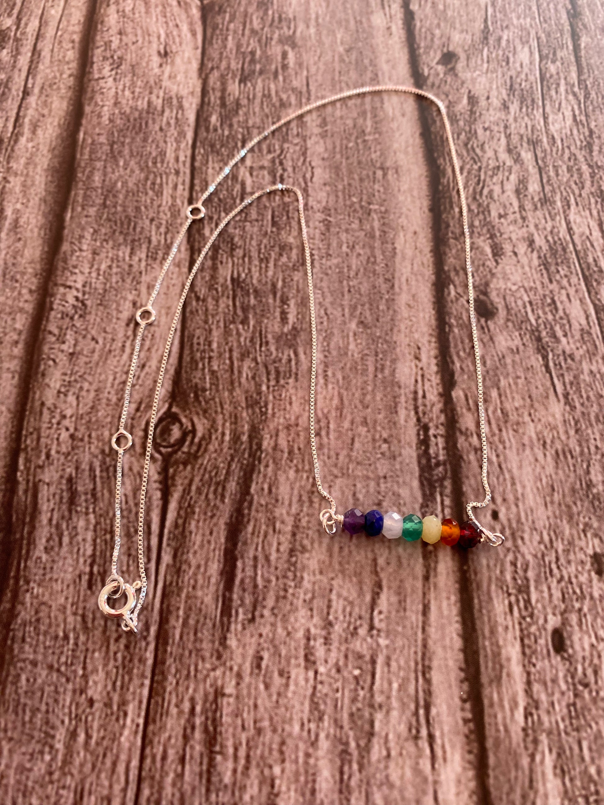 Elevate your spiritual journey with our Chakra Gemstone Sterling Silver Necklace, a beautiful piece designed to align and balance your chakras. Crafted with high-quality sterling silver, this necklace features seven carefully selected gemstones, each corresponding to one of the body’s seven energy centres. The gemstones include: